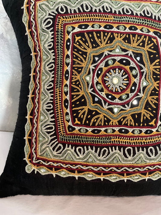 Rabari Hand Embroidered Pillow with Mirrors in black