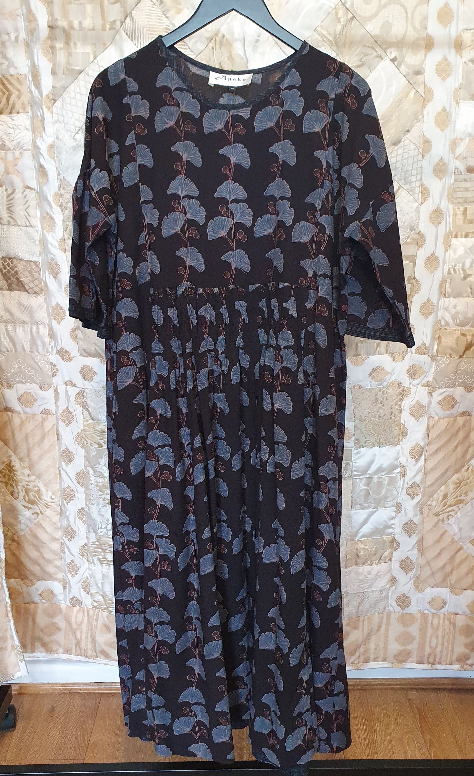 This beautiful dress is made from naturally dyed handwoven cotton and has a ruched centre front and back and at the tops of the sleeves. It has contrasting fabric on theneck, sleeves and inside hem. It has inseam pockets and is maxi length. This dress is oversized for comfort.