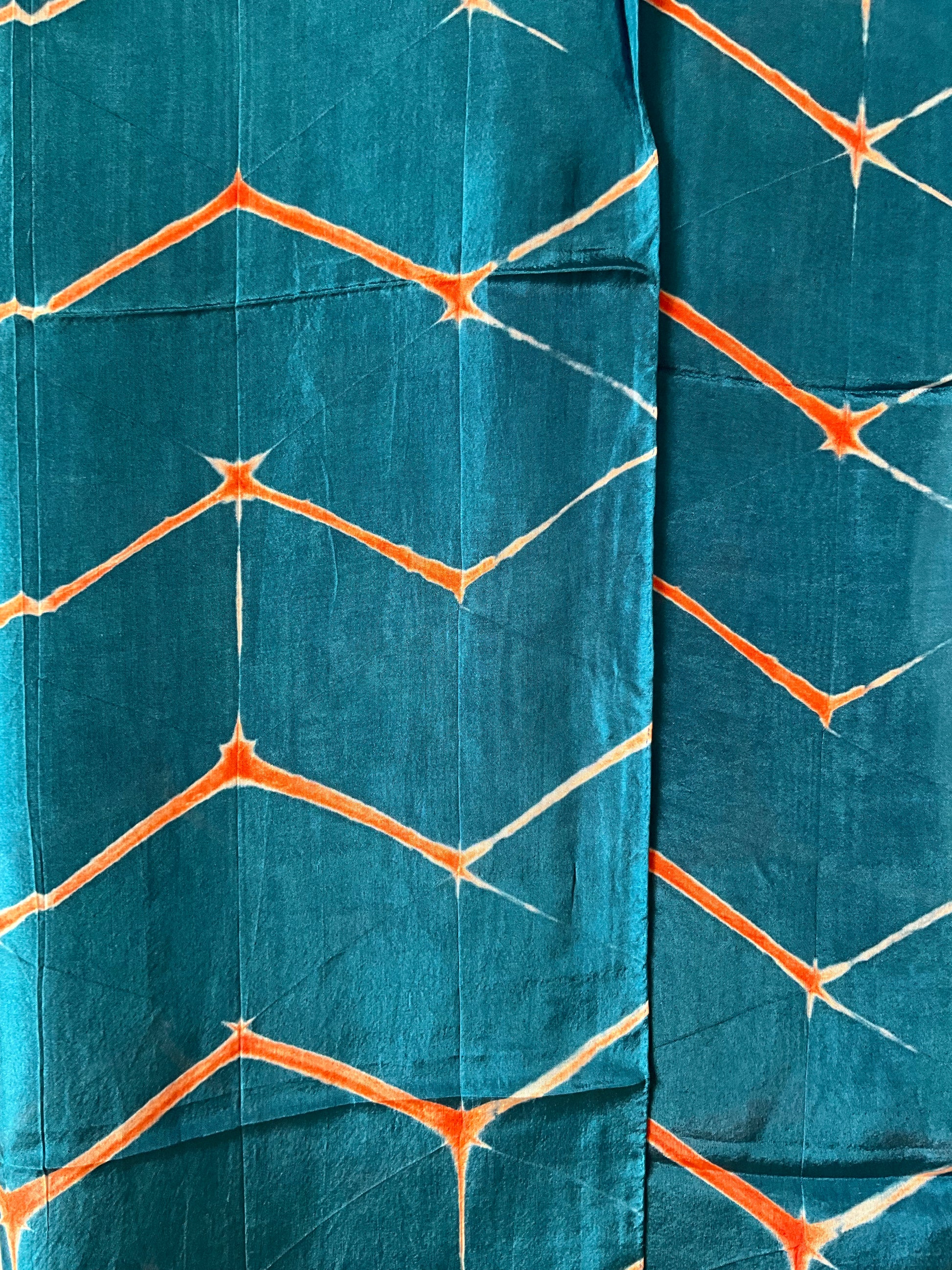 This beautiful silk scarf has been hand clamp shibori by arists in Gujarat India