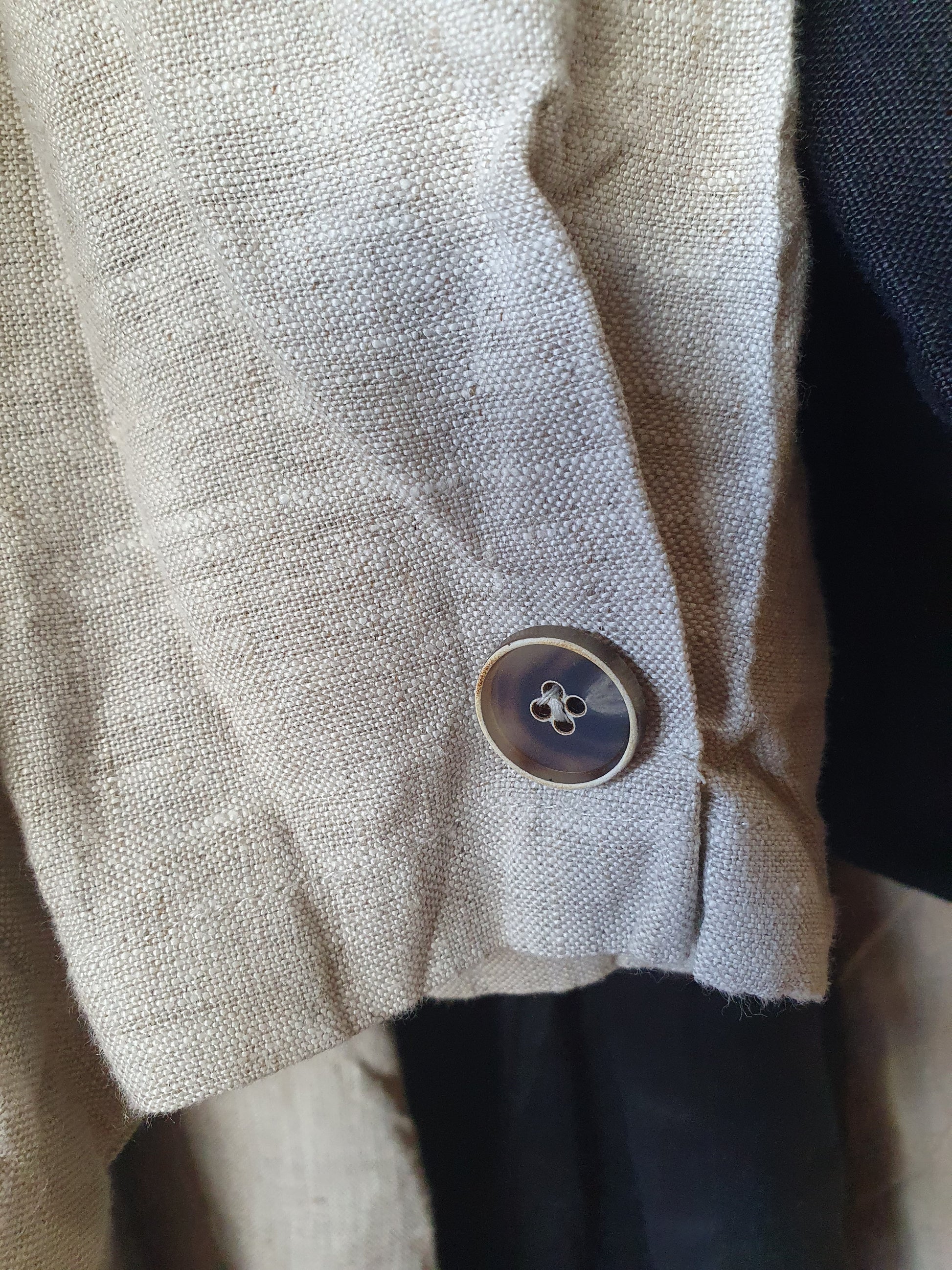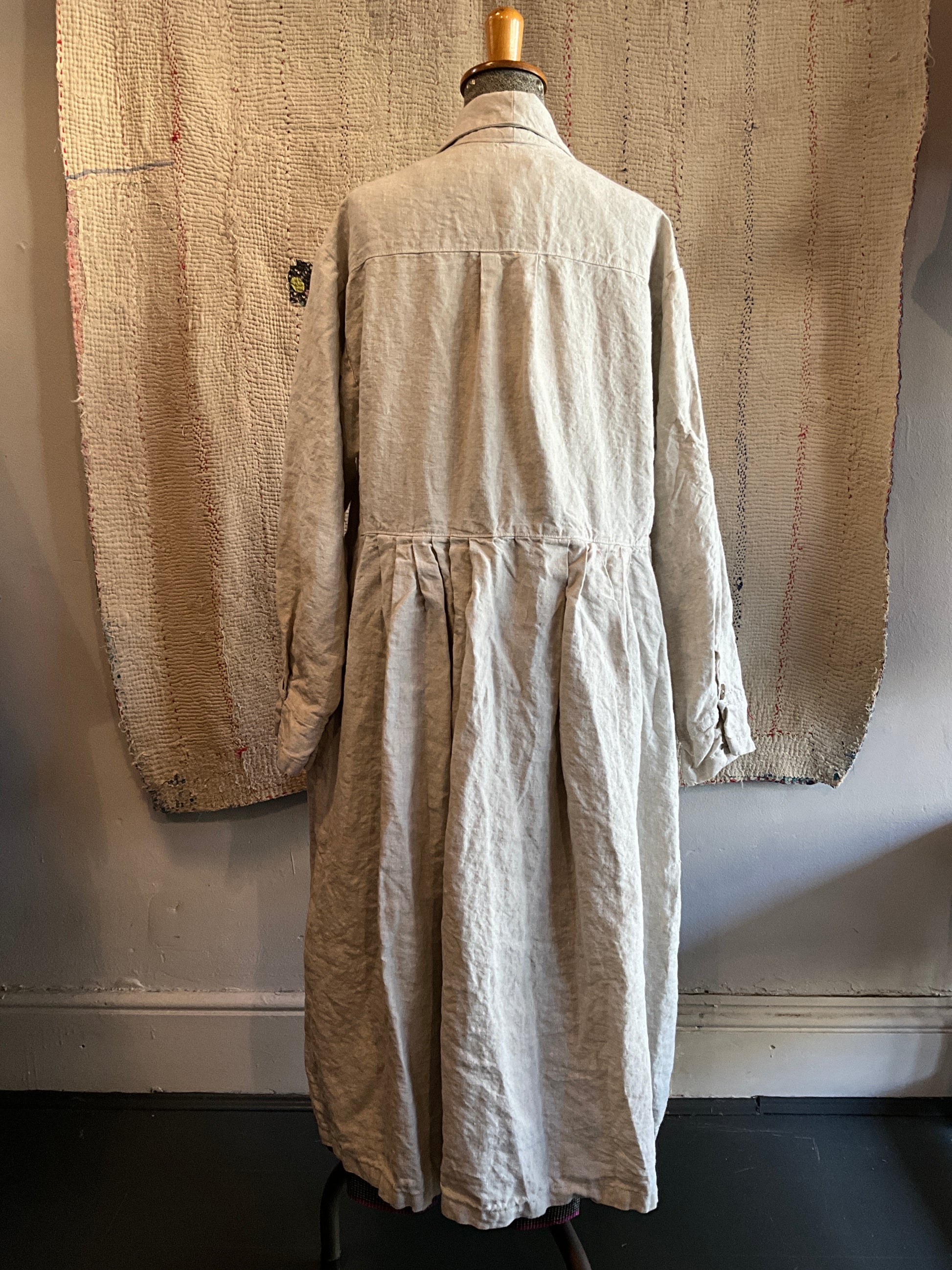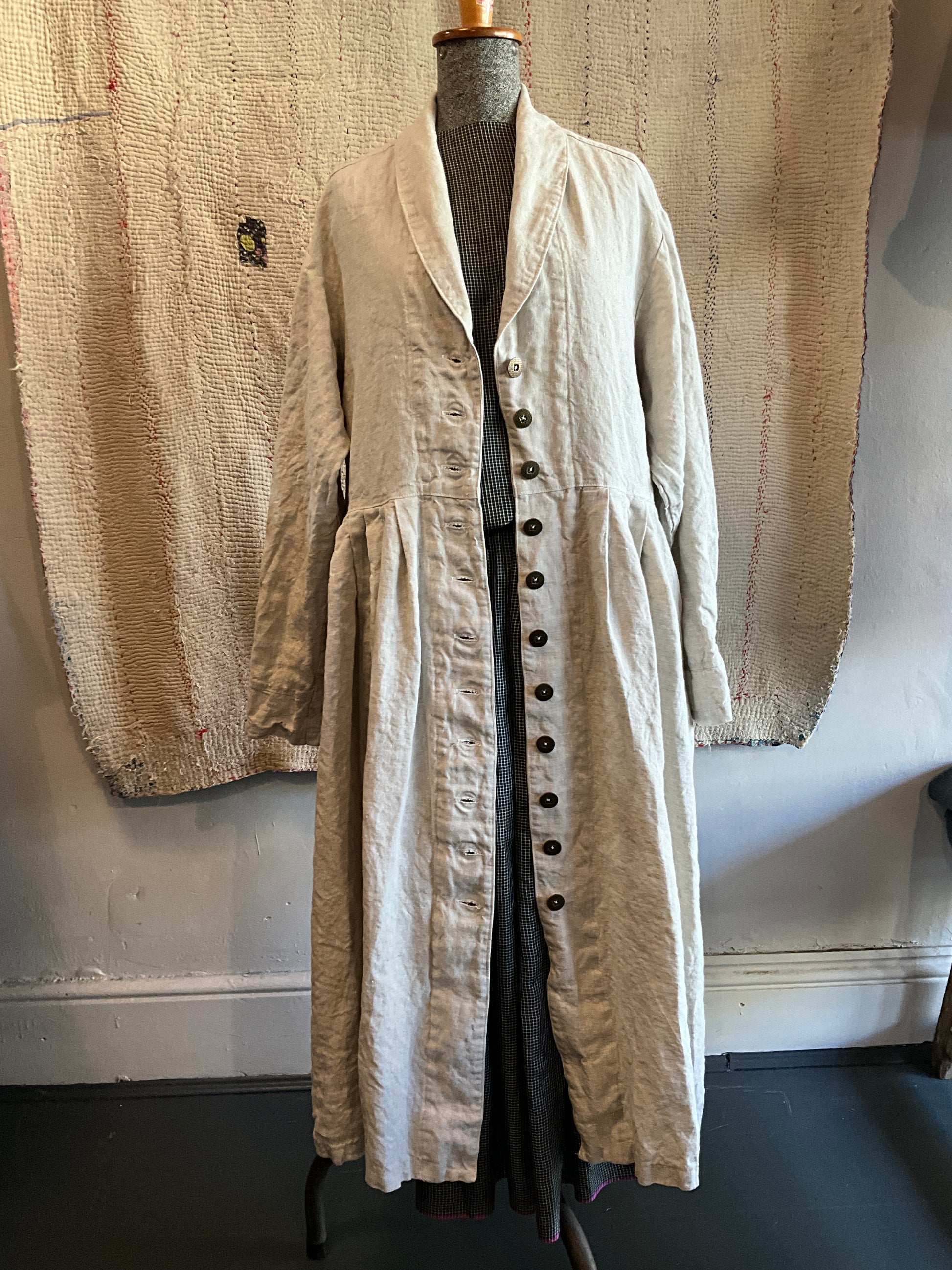This beautiful coat dress has been made from medium to heavy weight linen and has a shawl collar with waist pleats front and back, inseam pockets and has 11 buttons down the front. Sleeves have a button cuff. This looks fabulous worn as a loose coat or buttoned up as a dress.