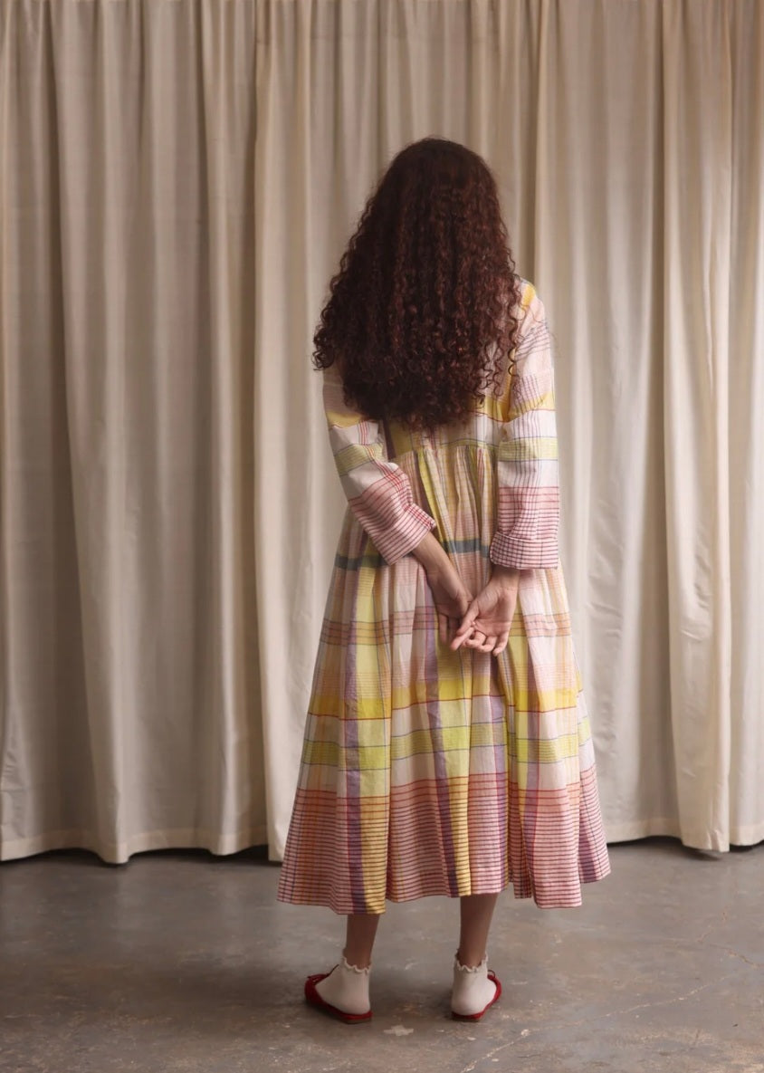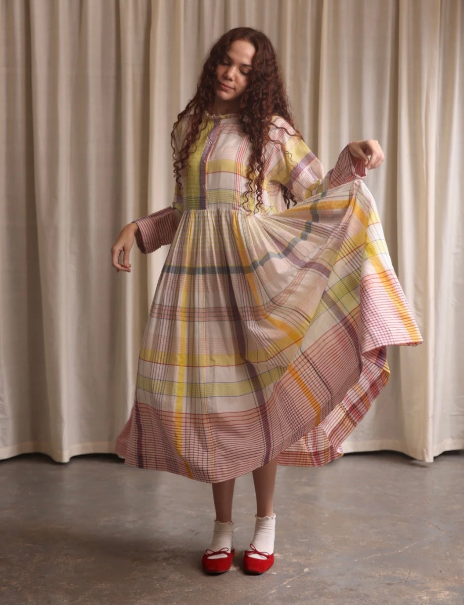 This stunning dress is made from handwoven cotton and is loose fitting with gathered waist, fabric button front, small frill at neck, inseam pockets, and long sleeves. It is mid calf length and is light and breathable. It is slightly see through and so would require a slip if needed.