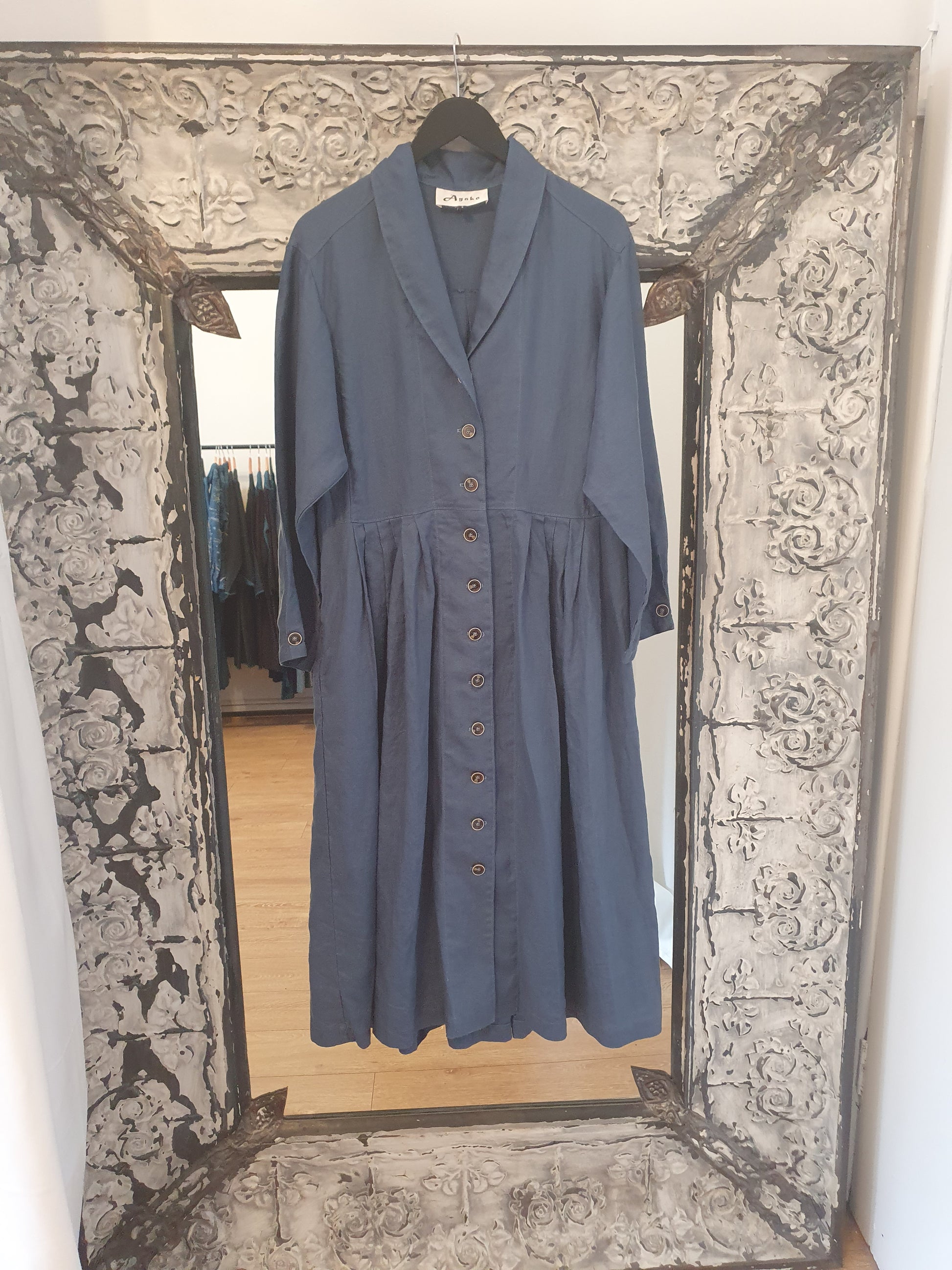 This beautiful coat dress has been made from medium to heavy weight linen and has a shawl collar with waist pleats front and back, inseam pockets and has 11 buttons down the front. Sleeves have a pleat and button. This looks fabulous worn as a loose coat or buttoned up as a dress.